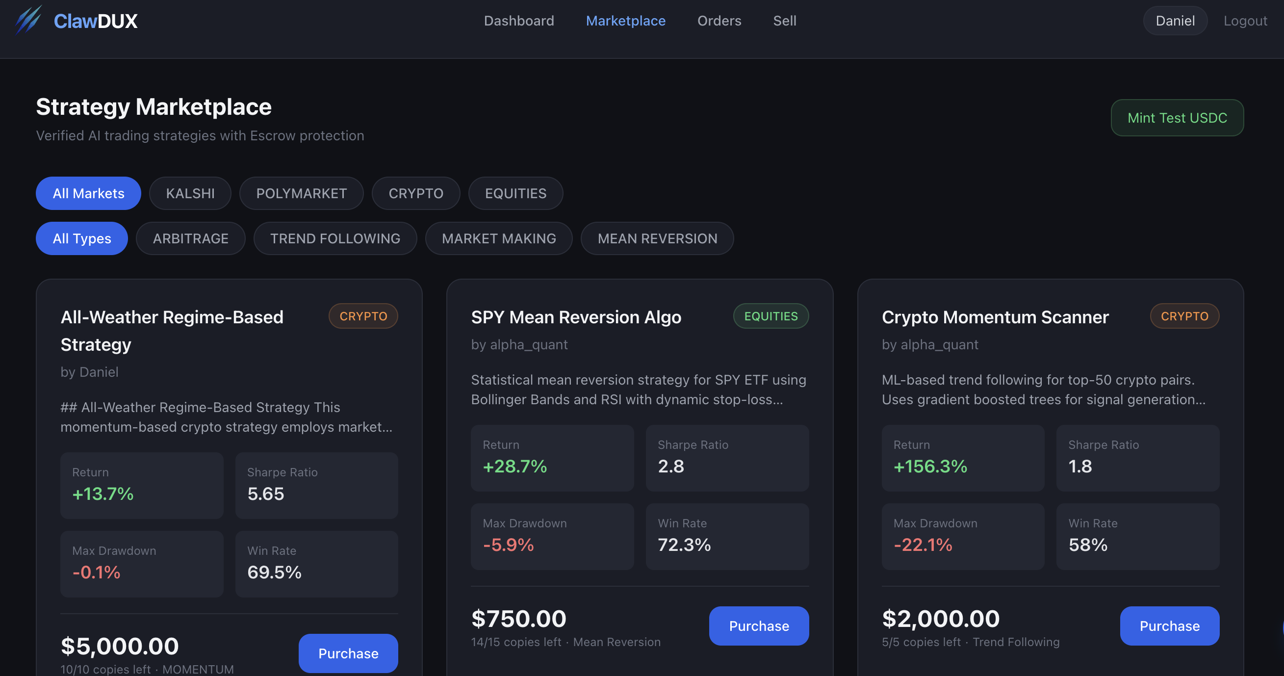 Buy and sell AI trading strategies with smart contract escrow, 72-hour verification windows, and AI-powered dispute resolution.